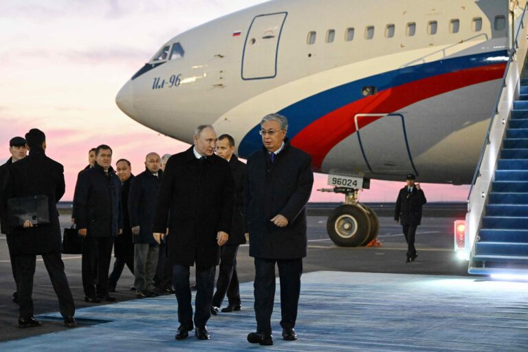 Venäjän diktaattori Vladimir Putin (vas.) tapasi Astanaan saavuttuaan Kazakstanin presidentin Kassym-Jomart Tomajevin 9. marraskuuta 2023. LEHTIKUVA / AFP, AFP / LEHTIKUVA / PAVEL BEDNYAKOV