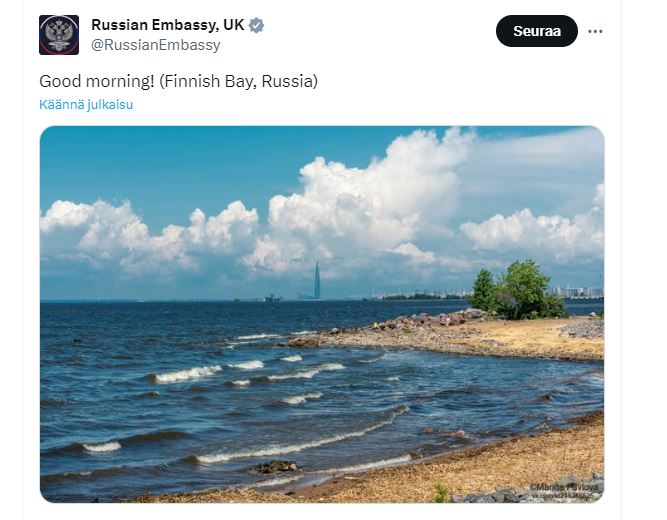 Venäjän Britannian-suurlähetystö on jakanut X-palvelun tilillään päivityksen, joka vaikuttaa aiheensa ja ajoituksena perusteella vihjaukselta Suomenlahden tapahtumiin.