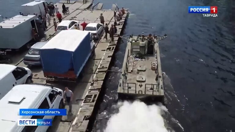 Venäjän valtiontelevision ykköskanavalla näytettiin, miten liikennöinti Dnepr-joen yli Hersoniin on järjestetty, kun ukrainalaisten HIMARS-raketeilla käyttökelvottomaksi pommittamaa Antonivkan siltaa ei käytetä.
