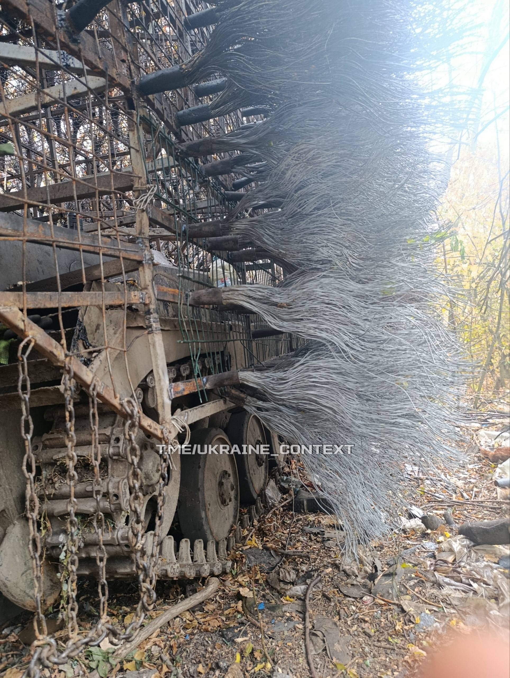 Kyse ei kuitenkaan ole puusta, vaan todennäköisesti teräsverkkoon kiinnitetyistä metallikaapelista. Ukraine Context -kanava kertoi lokakuun lopussa, että vaunuun kiinnitettävien metallikaapelien pituus on noin 80 senttimetriä. Tällaisia ”harjoja” saatetaan käyttää jopa 900 kappaletta ajoneuvoa kohden. Kanavan mukaan Ukrainankaan ei kannattaisi vähätellä menetelmää, mikäli se tosiaan tehoaa, vaan ottaa pörheydestä opiksi ja kopioida se omaan käyttöön.