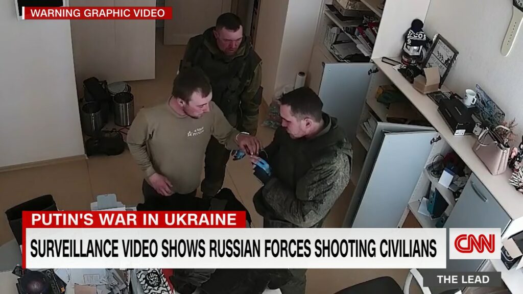 CNN:n haltuunsa saamalla turvakanavideolla näkyy, kuinka venäläissotilaat ampuvat takaapäin selkään kahta ukrainalaissiviiliä. Viisi venäläissotilasta ilmestyi kiovalaisen autoliikkeen luo 16. maaliskuuta ilmeisesti ryöstelytarkoituksessa. He yrittivät tunkeutua sisään autoliikkeeseen ampuen lukkoja ja rikkojen ikkunoita.