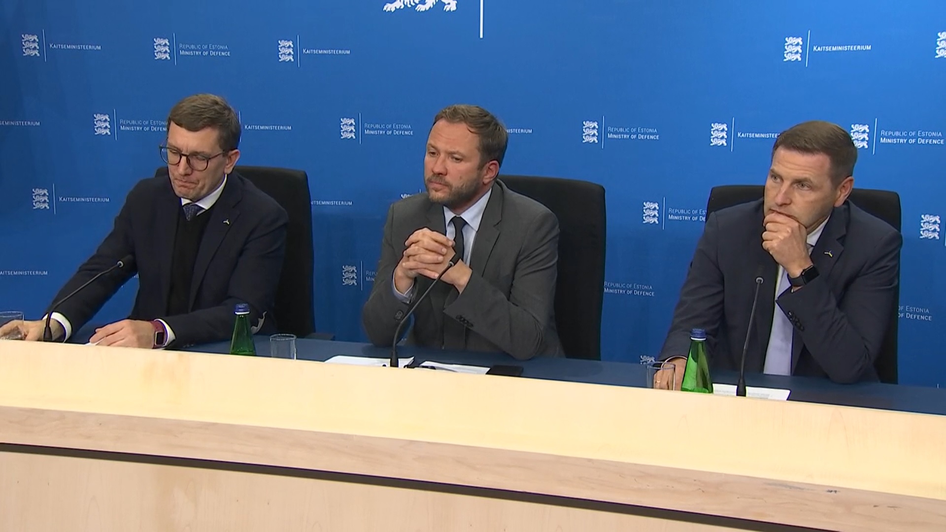 Viron puolustusministeriön tiedotustilaisuuteen osallistuivat puolustusministeri Hanno Pevkur, ulkoministeri Margus Tsahkna ja ilmastoministeri Kristen Michal.
