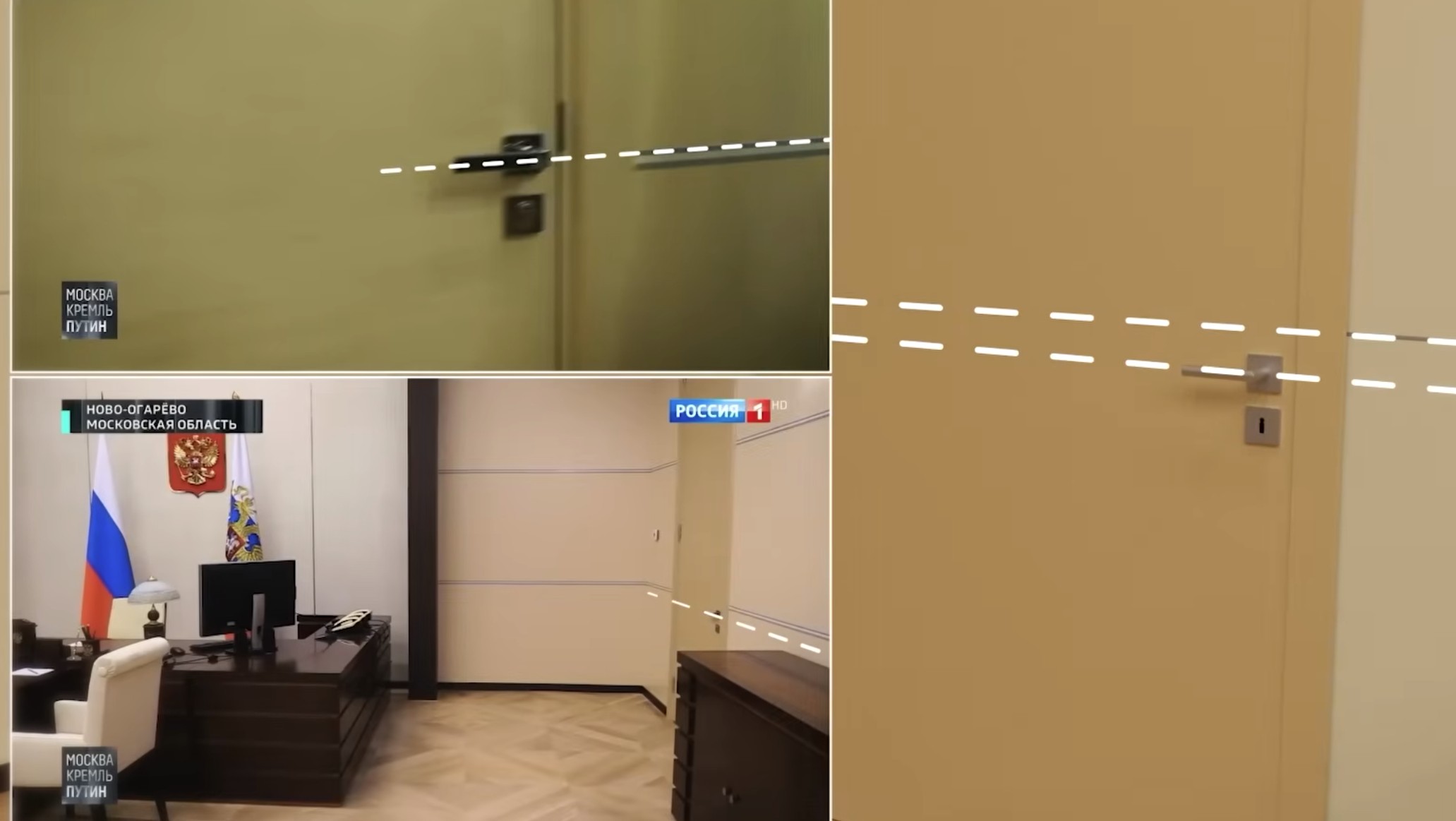 Tutkimuksessa kiinnitettiin huomiota pieneen yksityiskohtaan eli ovenkahvaan. Lokakuussa 2020 Rossija 1 -kanavalla näytettiin reportaasi, joka oli väitetysti kuvattu Putinin residenssissä Novo-Ogarevossa lähellä Moskovaa. Ovenkahva oli kuitenkin hieman korkeammalla kuin residenssin oikeassa toimistossa.