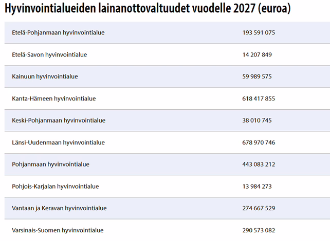 Kymmenen hyvinvointialuetta saa uutta lainanottovaltuutta vuodelle 2027, tiedottaa valtiovarainministeriö.