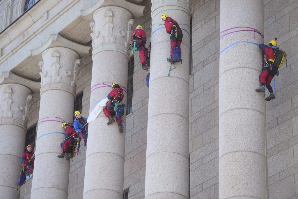 Poliisi otti keskiviikkona kiinni kahdeksan eduskuntatalon pylväisiin kiivennyttä henkilöä. Rikosnimikkeet ovat julkisrauhan rikkominen ja niskoittelu poliisia vastaan. Kiipeily eduskunnan pylväisiin oli osa ilmastonmuutoksen pysäyttämistä vaatinutta mielenosoitusta.