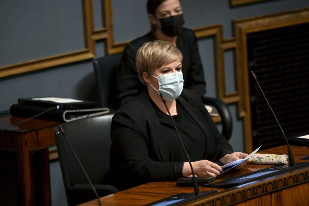 Annika Saarikko naurahti ministeriaitiossa. Keskustan puheenjohtajana Saarikko on itsekin hallitusta johtavan viisikon eli puoluejohtajien ryhmän jäsen.