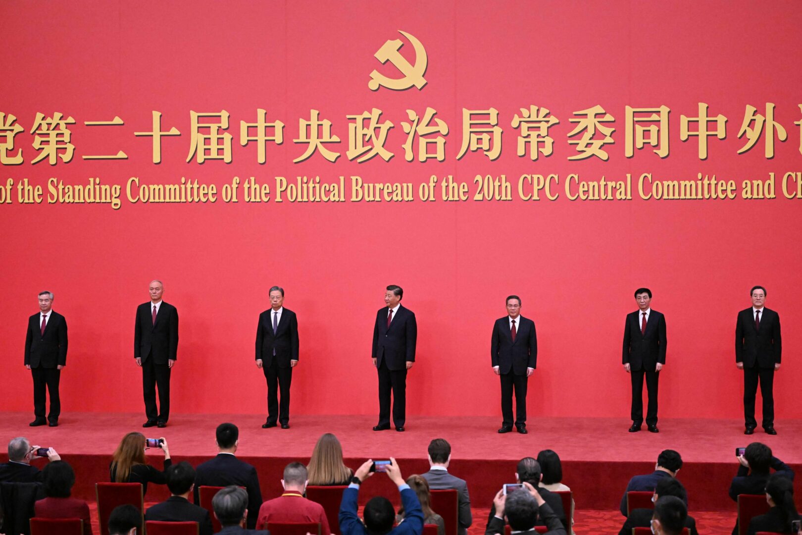 Kommunistisen puolueen pääsihteeri Xi Jinping (keskellä) ja muut politbyroon seisovan komitean kuusi jäsentä. AFP / LEHTIKUVA / NOEL CELIS