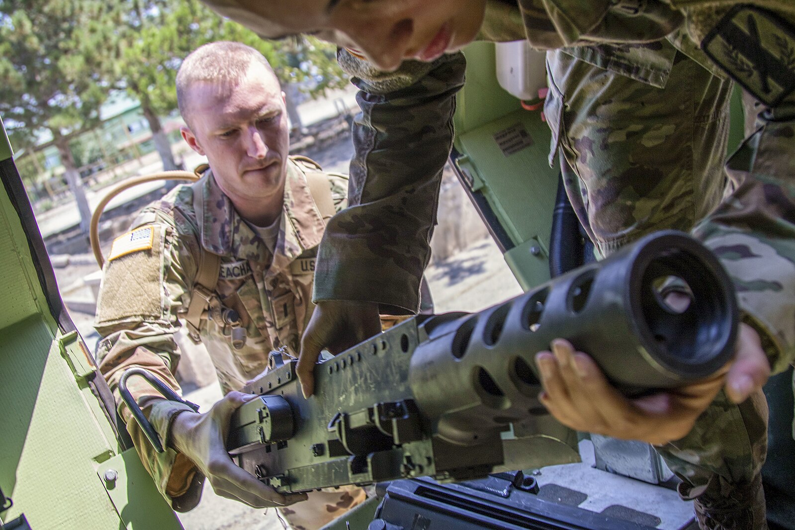 Yhdysvaltalaissotilas siirsi konepistoolia M1117-ajoneuvoon harjoituksessa vuonna 2019. Wikimedia Commons / Spc. Isaiah Matthews, U.S. Army National Guard