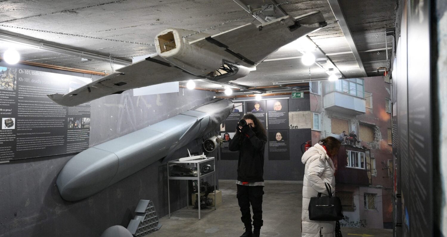 Venäläisdrooni Ukrainan sotaa esittelevässä berliiniläismuseossa. AFP / LEHTIKUVA / RALF HIRSCHBERGER