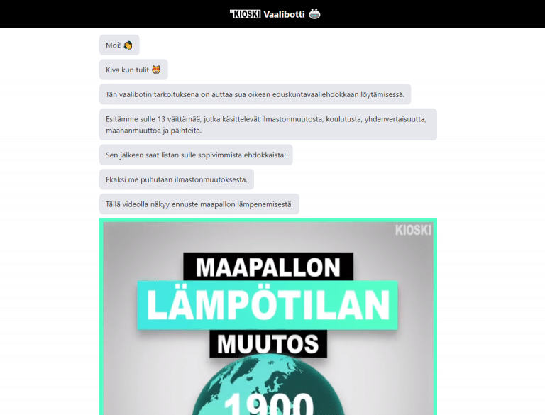 Chat-keskusteluksi rakennetussa ja ennen kysymyksiä näkyvillä taustoittavilla videoilla ja muulla materiaalilla höystetyssä koneessa on 17 kysymystä. Ne koskevat pääosin ilmastonmuutosta, koulutusta, perustuloa, translakia, vihapuhetta, maahanmuuttoa ja päihteitä.
