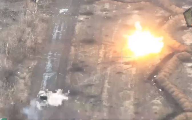 Puolustajien ampuma panssarintorjuntaohjus pysäyttää videolla venäläisten etenemisen.