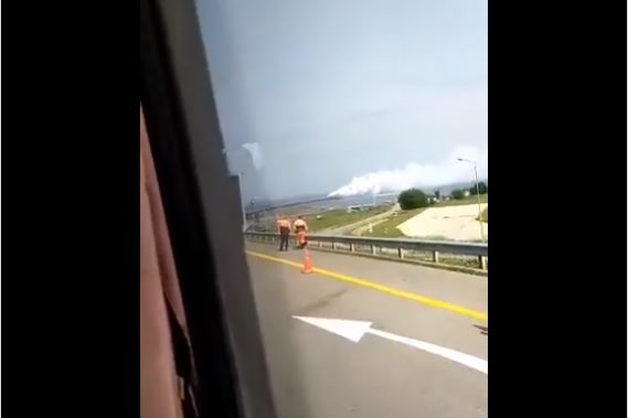 Kertšinsalmen sillan yllä sankka savupilvi, liikenne seisoi tuntikaupalla
