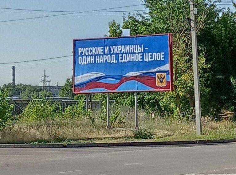 Miehitetylle alueelle on ilmestynyt hyökkääjän propagandaa tukevia mainostauluja.