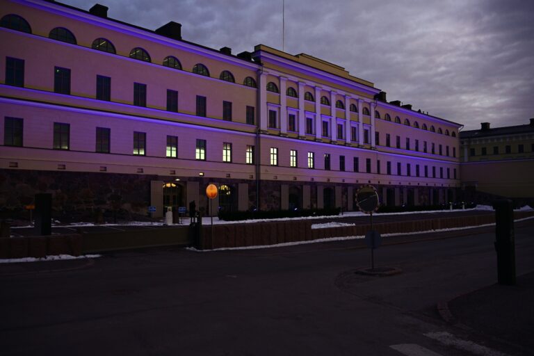 Ulkoministeriön rakennus valaistaan sinikeltaiseksi torstai-iltana.